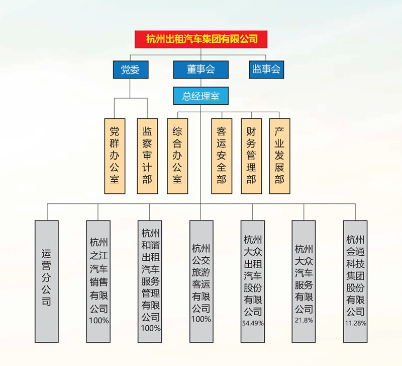 公司设6个管理部门,下辖运营分公司、之江销售、和谐服务、公交旅游等四家分(子)公司,参股金通科技公司。